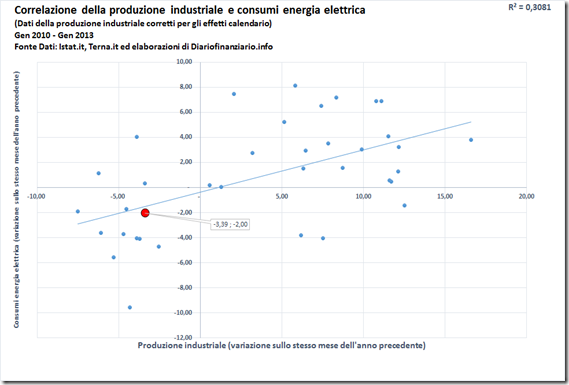 Anche quest’altro grafico è interessante, anche se la sua accuratezza è molto più bassa (R2<0,50). In questo caso però abbiamo verificato che dal 2010 ad oggi la tesi di Gpg Imperatrice risulta corretta. In pratica, se il consumo di energia elettrica cresce (o cala, il discorso è “a doppio senso”) rispetto all’anno precedente, lo stesso si può dire della produzione industriale.